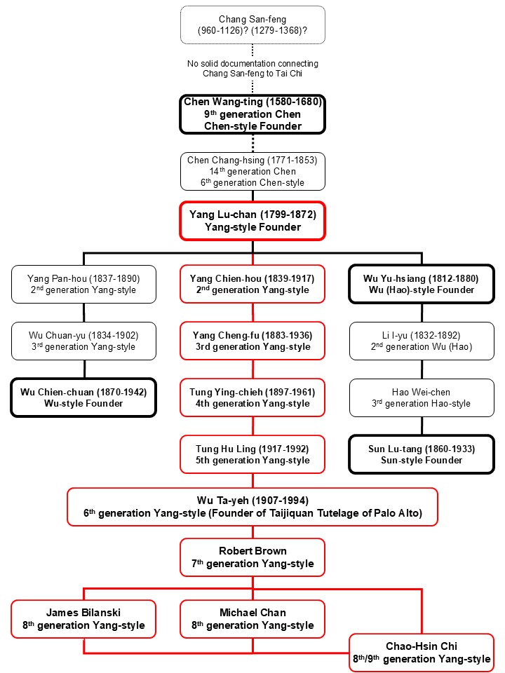 The following chart shows how the five major styles (Chen, Yang, Wu (Hao), Wu, and Sun styles) of Taijiquan (Tai Chi Chuan) relate to each other as well as the lineage from which our school (TToPA) comes from. The Yang style is highlighted in red and our school was founded in 1973 by Wu Ta-yeh.
