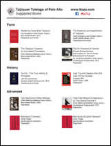 Suggested book for new taijiquan students Learning Tai Chi Chuan by Tung Kai Ying Other suggested books for taijiquan students of the Taijiquan Tutelage of Palo Alto (PDF file) See also these free translations by Paul Brennan: Taiji Boxing Explained ("The Red Book") by Dong Yingjie (Tung Ying-chieh) Dong Family Fast Set by Dong Huling (Tung Hu-ling) Methods of Applying Taiji Boxing by Yang Chengfu & Dong Yingjie (Tung Ying-chieh) Methods of Applying Taiji Boxing by Dong Huling (Tung Hu-ling) Suggested book for new I Liq Chuan students: Zhong Xin Dao/I Liq Chuan System Guide by Sam F.S. Chin |
